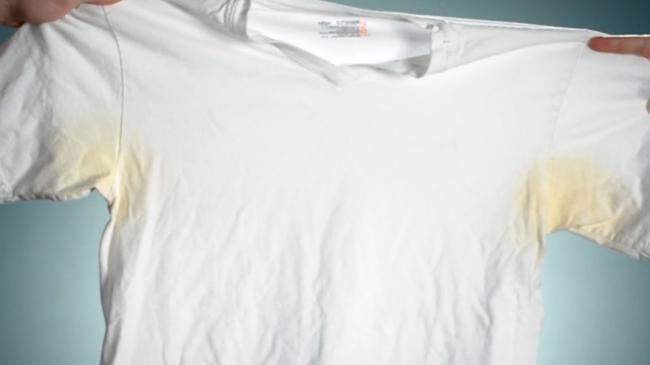 Пятна от пота на ткани в зоне подмышек смешиваются с солями антиперспирантов, и отстирать их сложно