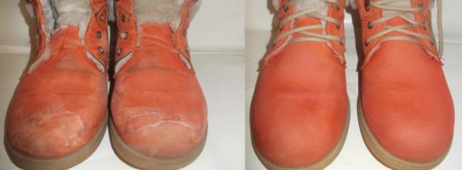 Решить эту проблему совсем не трудно, восстановить прежнюю окраску можно специальным спреем, подобранным по тону. Он стоит недорого, продается в каждом обувном магазине. Спрей распыляется на расстоянии 20-25 см от сапог или туфель, затем поверхность просушивается, и можно считать, что прежний вид и яркий глубокий цвет вернулись. После правильно проведенного окрашивания ворс придется поднять специальной щеточкой.