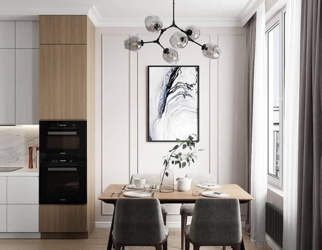 Обои подойдут для оформления стен с нишами и выступами, но если поверхность большая и гладкая, то ее дополняют молдингами, обрамляя полотна – такой способ актуален для классической кухни. По бокам можно установить узкие шкафчики или стеллажи, что поможет разделить пространство. Другой способ зонирования – использование стеклообоев. Их можно окрашивать до 10 раз, то есть менять дизайн часто и без больших затрат.