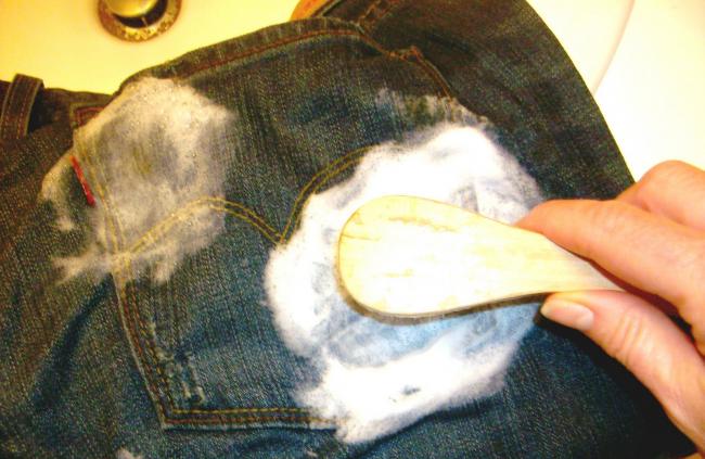 Это вещество применяется так же, как зубной порошок, но прежде мел измельчается до порошкообразного состояния. Затем средство наносится на жирные пятна и остается там до полной пропитки. После мел удаляется с джинсов щеткой, а сама джинсовая вещь загружается в стиральную машинку и стирается с использованием стирального порошка или какого-либо профессионального пятновыводителя.