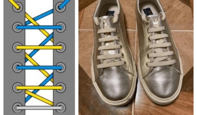 Для этого способа шнуровки потребуются шнурки разных цветов. Отлично смотрятся синий с белым.
