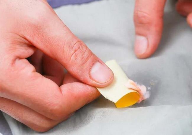Как отстирать жвачку таким средством: нанесите на загрязнённый участок и отскребите всё неострым ножом, протрите остатки средства салфеткой насухо, затем дополнительно просушите ткань. Дальше обычная стирка, и от пятна не останется и следа.
