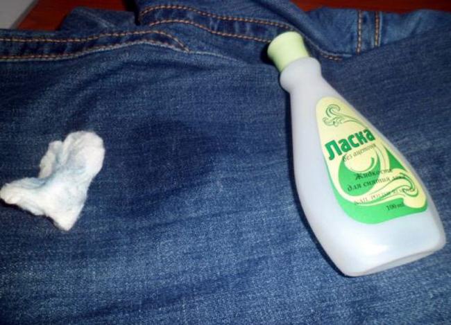 Удалить жевательную резинку с джинсовых брюк можно при помощи жидкого мыла (порошка) или средства для мытья посуды. Но загрязнение должно быть свежее.