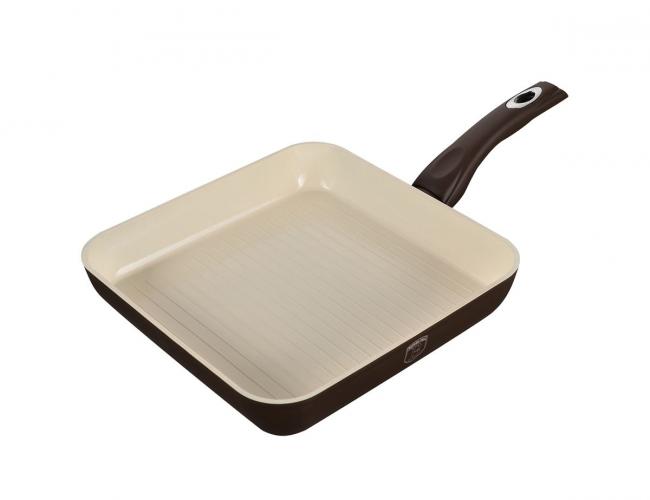 - Гриль – легко узнаваемые изделия благодаря наличию ребристого донышка, которое образует на еде привлекательные зажаренные полоски. Имеет круглую или квадратную форму, а также оснащается двумя ручками – продолговатой и закругленной. Гриль хорош тем, что позволяет жарить без масла, пища готовится быстро и не пересыхает внутри.