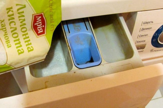 Если стиралка нуждается еще и в «ударной» дезинфекции, можно использовать дополнительный компонент – хлорку. Лимонную кислоту засыпают все в тот же основной отсек для моющих средств.