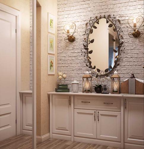 Возможно сочетание панелей с фресками. Например, две-три стены обшиваются панелями, а на одной – помещается фреска, вписывающаяся в дизайн интерьера комнаты. В коридоре хорошим решением будет сделать зеркальные вставки. Их можно поместить под потолок, над подвесными полочками, если такие имеются, или в нише.