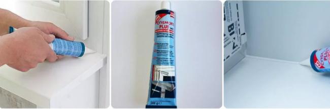 Часто используется как герметик для заделки щелей между подоконником и рамой. Шов герметичный, не пропускает воду и воздух.