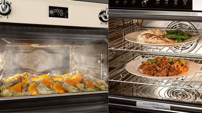 Устройства с конвекцией оборудованы вентилятором. Он “перемешивает” воздух внутри во время готовки, не давая ему остывать. За счет этого блюда готовятся быстрее и прогреваются равномернее. Иногда для усиления эффекта в духовки устанавливают 2 вентилятора.