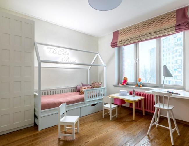 Для экономии места в детской часто устанавливают двухъярусные кровати-домики, размеры которых позволяют использовать подкроватное пространство для установки дополнительного спального места, шкафа для вещей или стола для выполнения домашнего задания. Школьнику такая конструкция вполне подходит и считается безопасной.