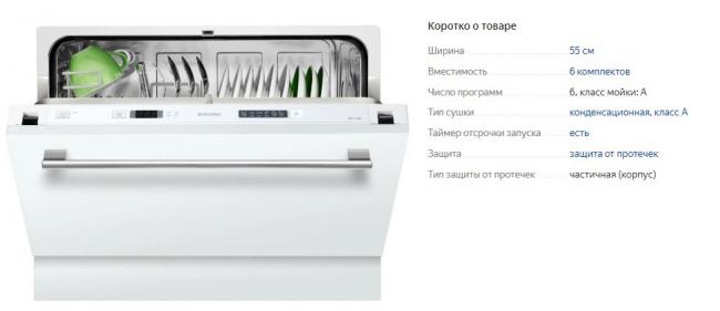 Моет до 6 наборов посуды, при этом потребляя электроэнергию 0,58 кВт/час. Расход воды за один цикл составляет около 6 л. Встраиваемые программы подобраны с учетом интенсивности загрязнения посуды. Тихий режим работы, уровень шума не превышает 50 дБ. По завершении работы издает звуковой сигнал.