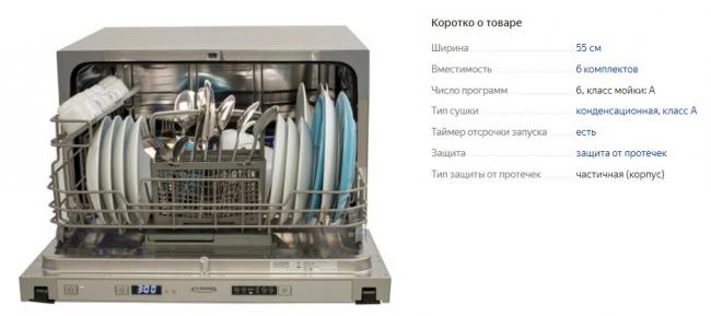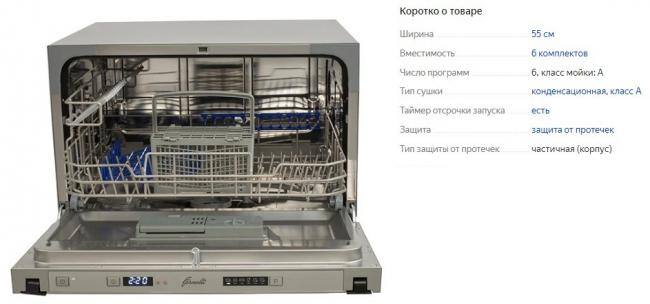 Небольших размеров кухонная техника за один цикл работы способна вымыть до 6 наборов посуды, потратив при этом около 7 л воды. Работает тихо: уровень шума составляет до 50 дБ. Наличие шести температурных режимов позволяет подобрать подходящий и отмыть даже въевшуюся грязь. Есть звуковой сигнал, напоминающий, что цикл мойки завершен, а также таймер, с помощью которого можно отложить запуск устройства.