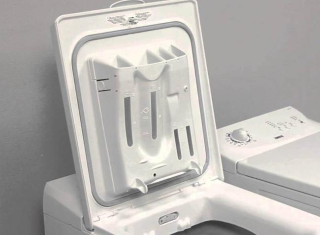 - В тех агрегатах, где загрузка вертикальная, лоток расположен на внутренней стороне люка или непосредственно на его крышке.