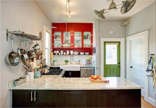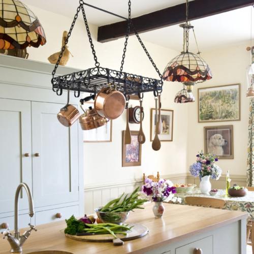Подвесные рейлинги напоминают решетку, свисающую с потолка. В основном их размещают над «островками» или барными стойками. Такого рода подвески не только хранят кухонные принадлежности, но и бокалы, кастрюли, сковородки и чашки.
