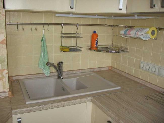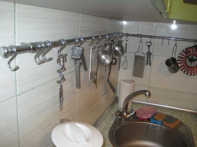 Установка рейлингов на кухне выполняется под навесными шкафами на расстоянии до 10 см от нижней стенки конструкции. При помощи специальных крючков к металлической штанге можно прикрепить контейнеры, сетчатые полочки и другие предметы.