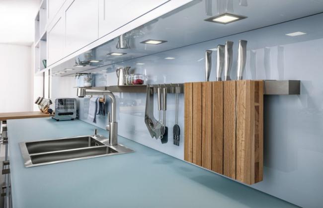 Количество горизонтальных штанг может соответствовать количеству навесных шкафов, расположенных над рабочей зоной. Загромождение большим количеством рейлингов часто приводит к захламлению кухонных стен.