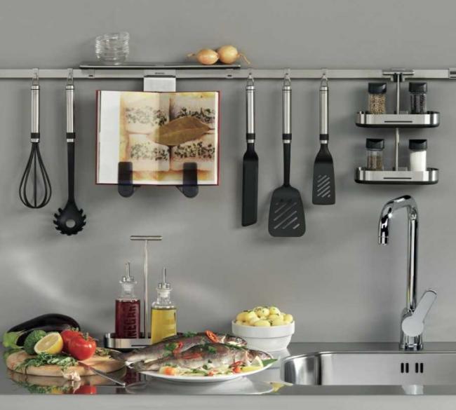 Функциональность кухни и рейлинговой системы в частности повысят правильно подобранные удобные аксессуары.