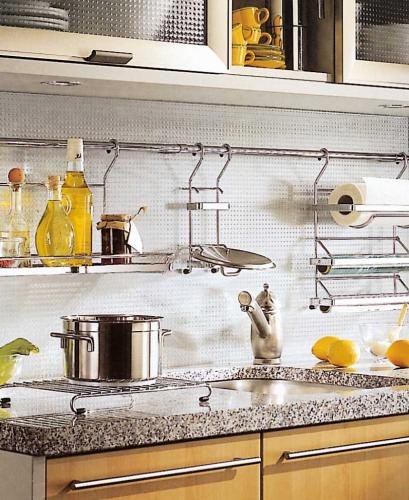 Необходимо отдельно отметить еще один вид аксессуаров для рейлинга – держатели, которые используют для размещения бокалов, ножей, продуктов питания или хлебниц. Вариантов их применения огромное множество, и хозяйка всегда найдет наиболее рациональный.