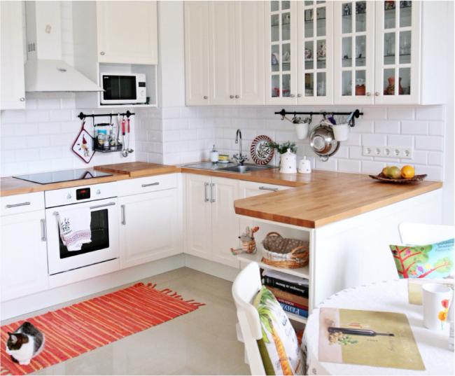 Необходимость дополнительной уборки. Развешанные на рейлингах полочки, смотрятся симпатично. Но кухня – это помещение с повышенной эксплуатационной нагрузкой. В помещениях с газовой плитой ситуацию усугубляет копоть