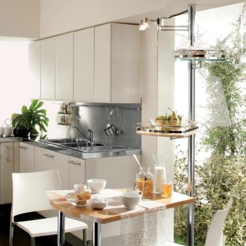 Для всевозможных баночек, бутылочек и прочей кухонной утвари применяют полочки, производители их выпускают в огромном разнообразии. На них также можно поставить миксер и кофемолку. Интересная новинка – полочка для поваренной книги, любимый рецепт всегда будет перед глазами во время готовки.