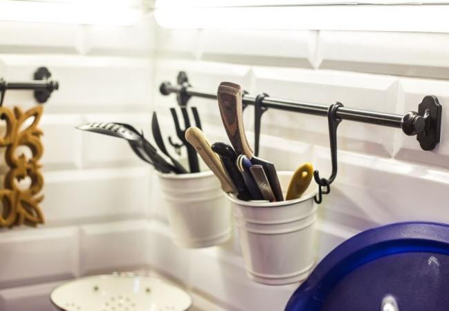 Так, например, нет смысла вешать на рейлинги весь запас кухонных принадлежностей и кружек – ведь если не пользоваться ими каждый день, они будут покрываться пылью и в нужный момент вам придется потратить время на то, чтобы ополоснуть утварь. Да и развешивать помытые приборы по крючкам не слишком удобно.