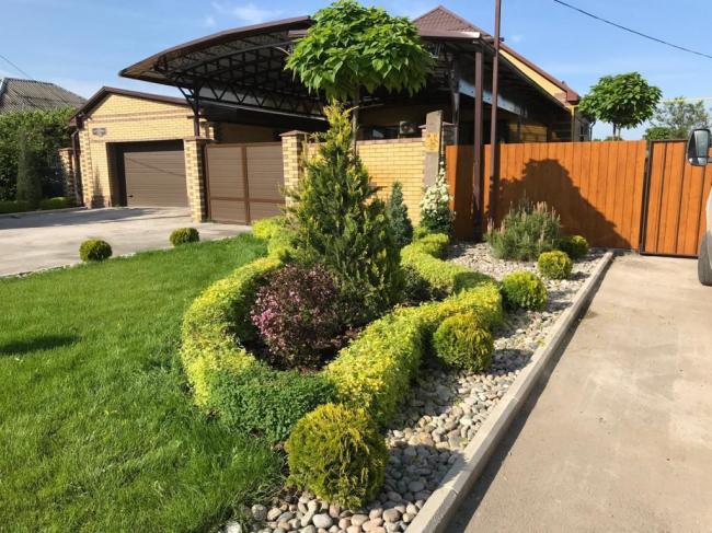 - Посадить по периметру живую изгородь, кустарники, деревья. Для этого лучше использовать виды, которые хорошо переносят формировку кроны (например, вязы, туи или можжевельники).