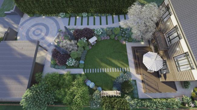 Например, ландшафтные дизайнеры советуют деревья располагать с северной стороны, середину двора оставить на кустарники, а растения, которые любят солнце, посадить на южной стороне участка