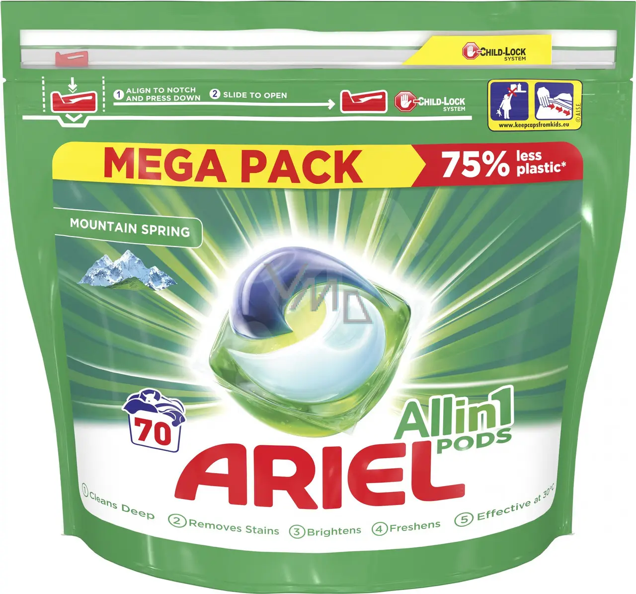 Каждая из подушечек заключена в специальную водорастворимую оболочку. Находящийся внутри концентрированный гель, высвобождаясь в процессе стирки, смешивается с водой и обеспечивает качественное отстирывание.