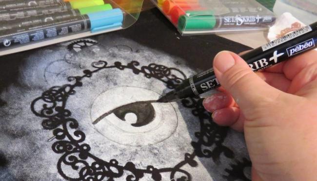 Фломастеры востребованы в ручной росписи тканей. Вариативная толщина стержня создает уникальную картину, без каких либо сложностей. Композиция может быть крупной и содержать множество мелких деталей, или же попросту быть не большой. В любом случае она выйдет аккуратной, без смазанных контуров и наплывов, снижающих детализацию. Опытный специалист умело преобразит любую вещь, добавив яркий и оригинальный арт (футболки, сумочки, реже штаны, и даже обувь (кеды)).