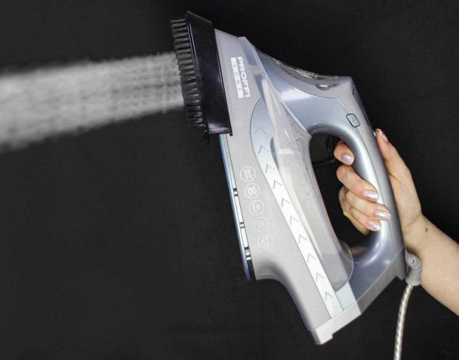 - Глажка. Утюжок по ткани ведите плавно и не спеша, вертикально сверху вниз. Для дополнительной очистки или заутюжки используйте накладки и щетки с фиксаторами.