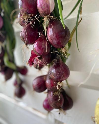 Хранить лук, убранный с грядок надежнее в косах – на стенах кухни они смотрятся оригинально. Только вешать их желательно подальше от радиаторов отопления. Если такого места нет, рядом ставят воду, которая спасет урожай от пересыхания. Для плетения выбирают полностью созревшие головки.