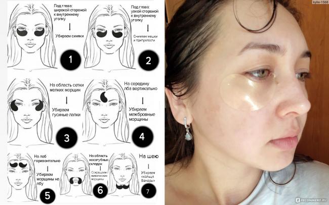 Патчи имеют характерную форму — заужены с одной стороны. Многие девушки интересуются, эту сторону лучше направлять к центру лица или к вискам? Можно использовать оба варианта. Это зависит от того, какой результат нужен. Если задача — убрать «гусиные лапки» и разгладить заломы возле висков, нужно узкую сторону направлять к переносице. Если цель — осветлить тёмные круги под глазами, прикладывайте к центру широкую сторону.