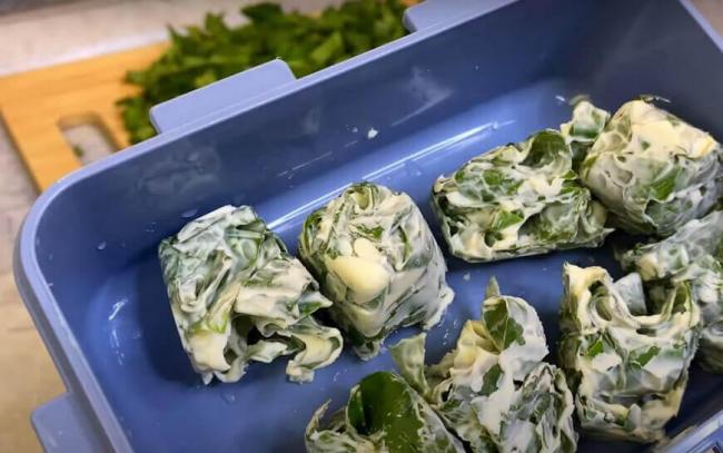 Этот способ хорошо подходит для тех домохозяек, которые хотят сохранить максимум места в морозилке и, в то же время, сделать вкусную заготовку на зиму. Это объясняется тем, что после обработки масса листьев значительно уменьшится, поэтому сложенная зелень в брикеты не займет много места.
