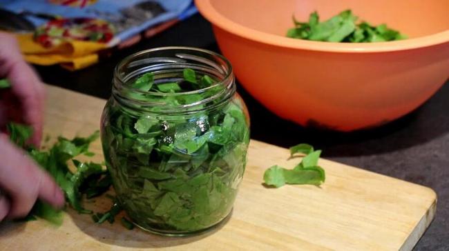 - Поместите листочки в банку. Не забудьте плотно утрамбовать!