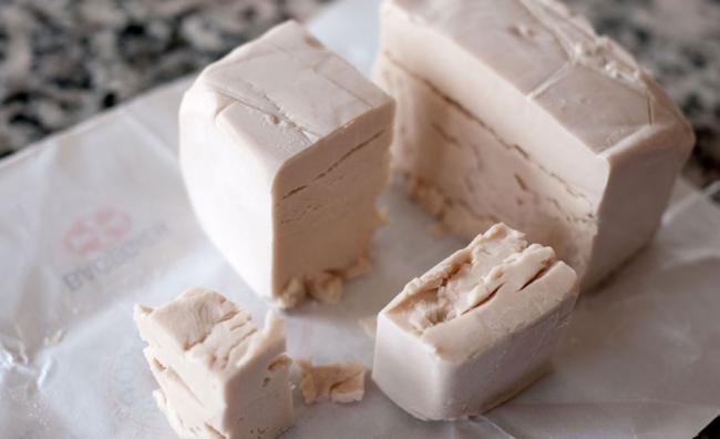 Свежие дрожжи выпускаются в виде блоков, а не порошка. Блок влаги 70%. Это бледный цвет. Этот блок мягкий и легко крошится. По консистенции он более густой, чем порошковые дрожжи, а также имеет более сильный запах.