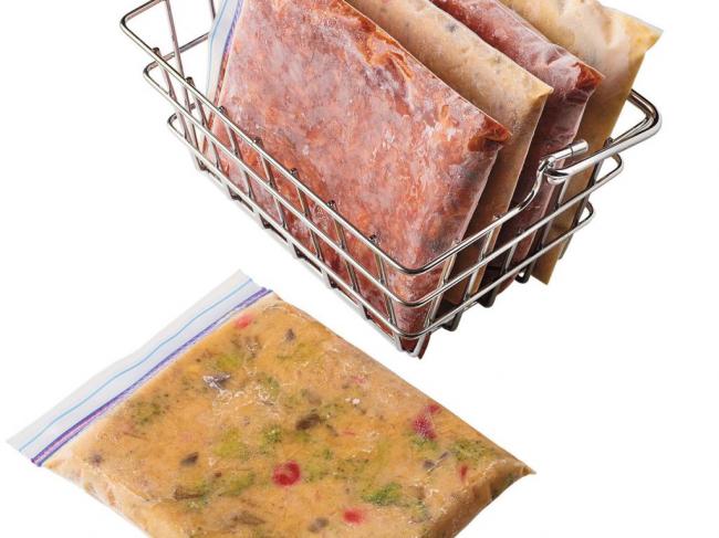 Для этого нужно подобрать емкость, в которую вы составите пакеты с супом до замерзания содержимого. Сразу разместите в нее пустые пакеты и аккуратно разверните их, чтобы было удобно наполнять. Налейте необходимое количество супа, после чего плотно завяжите и уберите в морозилку. Можно приобрести специальные пакетики для заморозки с замочками, они являются многоразовыми. Их можно помыть и использовать повторно.