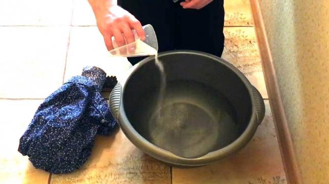 - Набрать теплую воду в таз и тщательно растворить в ней моющее средство. Если рубашка сильно заношена, рекомендуется предварительно обработать грязные места хозяйственным мылом или допустимым к использованию пятновыводителем.