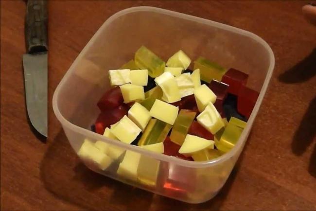 Разноцветные кусочки можно сделать и из обмылков детского мыла, добавив натуральные красители.