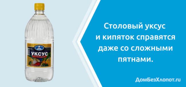 - Уксус и кипяток. Опять же, если пятно было поставлено недавно, вы можете воспользоваться этим эффективным методом. Просто натяните «пострадавшее» изделие над кастрюлей, после чего растворите в кружке кипятка столовую ложку уксуса и полейте полученным раствором загрязненные участки. Продолжайте это делать до тех пор, пока от пятен ничего не останется. Совсем маленькие следы можно удалить ваткой, смоченной в уксусе.