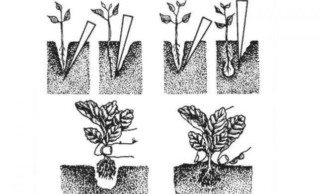 - пикировка производится острым ножом под углом в 45 градусов и на глубину трех сантиметров — таким образом обрезается часть корневой системы, что простимулирует ее дальнейшее развитие;