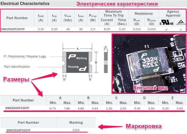 На следующем изображении показаны основные электрические характеристики, размеры элемента, а также его маркировка. Данные взяты из даташита на серию SMD2920 HF Series Surface Mount PTC Devices.