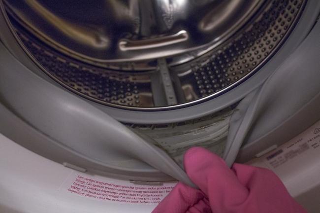 Чистка уплотнительной резинки необходима, так как именно в ней чаще всего накапливаются влага и грязь, вследствие чего образуется плесень. Чистку производят Пемолюксом или с помощью соды. Подойдет также раствор уксуса. Им лучше смочить ткань и намотать ее на палец. Так вы доберетесь до всех складок. Лучше делать это сразу после стирки, когда уплотнитель влажный.