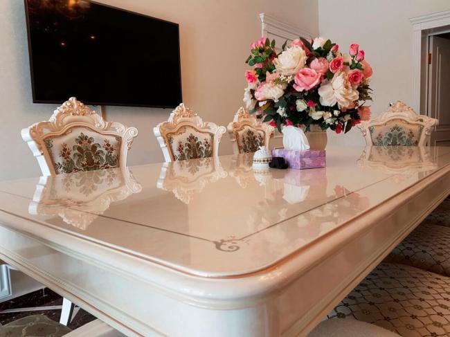 Достаточно часто хозяева кафе и ресторанов выбирают такие скатерти для защиты столов, особенно это важно для мебели, произведённой из древесины. Прозрачная скатерть “мягкое стекло” на столе не скроет древесной фактуры и вместе с тем сможет надежно защитить поверхность столешницы