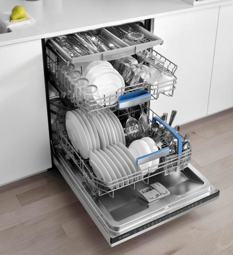 Особенности содержания – разные отсеки для посуды и столовых приборов. Третий выдвижной ярус – это отдельный поддон для столовых приборов, где вилки, ножи и ложки размещаются горизонтально. Такой вариант безопаснее, чем лоток, так как нет риска случайно порезаться ножом при разгрузке.