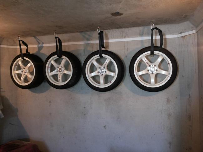 Шины на дисках также можно хранить и в подвешенном состоянии с помощью крюков и ремней