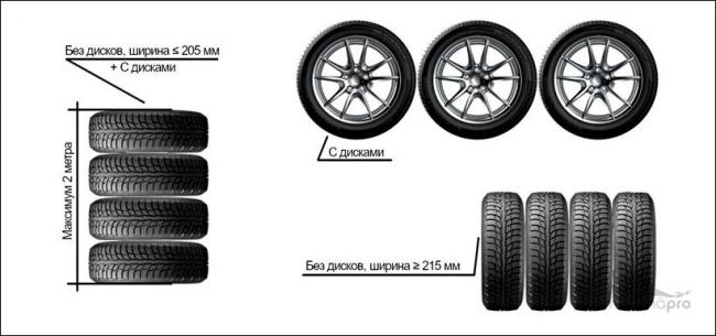 Максимальная высота штабеля составляет 2 метра. Скаты шириной от 215 мм ставят