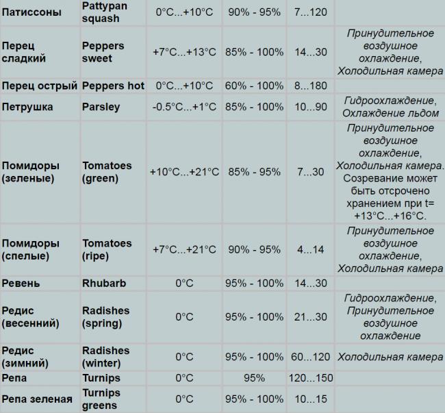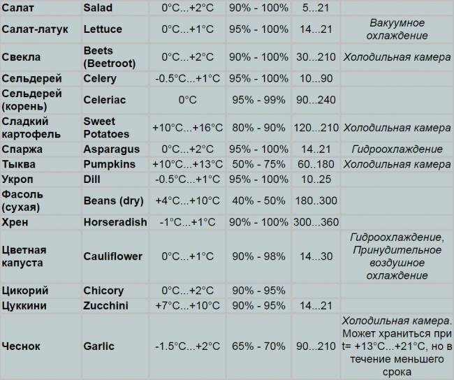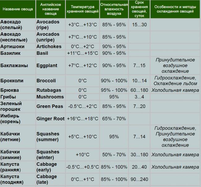 Диапазон значений температур и уровня влажности достаточно узкий. Так, овощи должны находиться в помещении с такими параметрами окружающей среды: