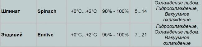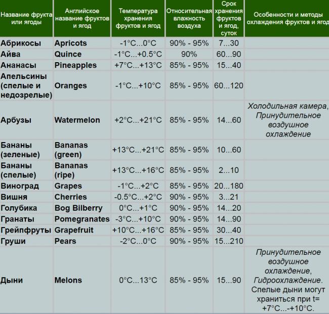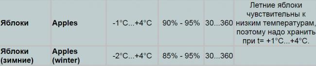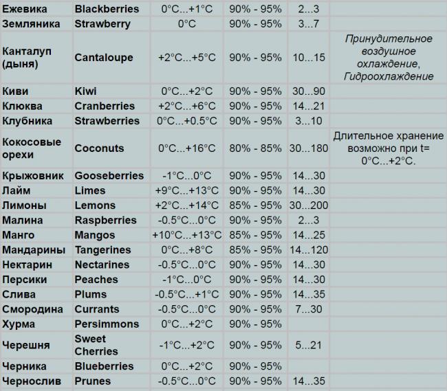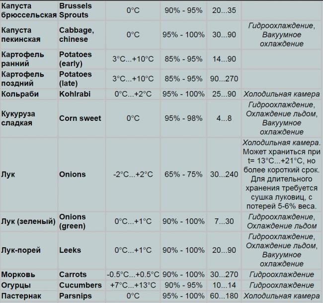Столбец «Температура хранения» — это оптимальный температурный режим хранения овощей и фруктов. Из таблиц видно, что есть несколько групп овощей и фруктов, которым требуется одна и та же температура воздуха для оптимального хранения. Такое объединение продуктов позволяет более эффективно использовать хранилища для плодоовощной продукции.