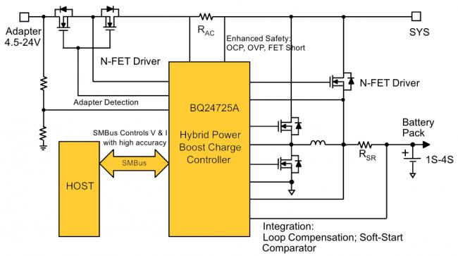 В микросхеме BQ24725A применена топология синхронного понижающего преобразователя, которая вместо внешнего диода Шоттки (асинхронная топология) использует встроенный MOSFET-транзистор. За счёт его применения снижаются потери и увеличивается КПД преобразователя.