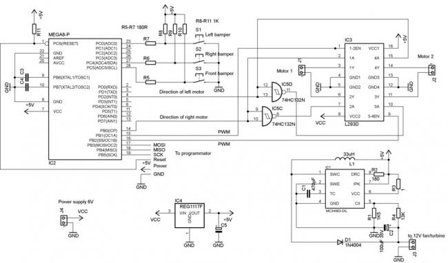 Питание схемы осуществлятеся от 6 вольтового аккумулятора. Управление осуществляется при помощи ШИМ сигналов который поступают на вход драйвера микросхемы L293D. Робот имеет 3 кнопки которые механически соеденины с “бамперами” робота на его корпусе.