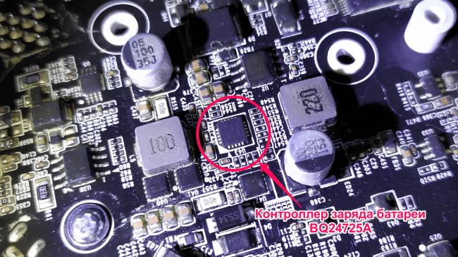 На материнской плате робота-пылесоса контроллер BQ24725A имеет позиционное обозначение U43. Маркировка на корпусе микросхемы BQ25A. Корпус VQFN20.